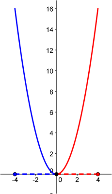 Wir können aber die Umkehrfunktion bilden, wenn wir den Definitionsbereich einschränken, z.B. \(0\le x \le 4\). Wir kehren also nur einen "Ast" der Funktion um. \[ y=x^2 \] \[ x=+\sqrt{y} \] \[ \bar{y}=+\sqrt{x} \] Auch hier beachte man, wie Definitions- und Wertebereich ihre Rollen tauschen. Entsprechend könnte man natürlich den blauen Ast umkehren.