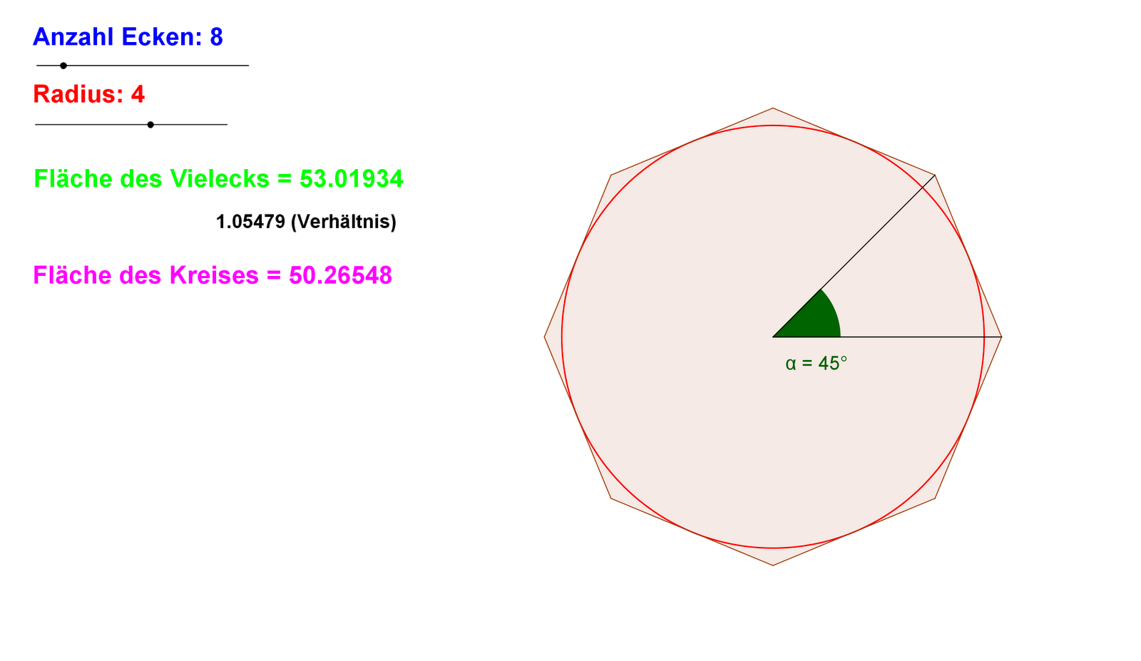 \[ \begin{align} 8A_\vartriangle&=8\frac{1}{2}r^2\sin45^\circ\\ 8A_\vartriangle&=8\frac{1}{2}16\frac{1}{\sqrt{2}}\\ 8A_\vartriangle&=\frac{64}{\sqrt{2}}\\ 8A_\vartriangle&\approx45.2548 \end{align} \] Die Abweichung von der Kreisfläche ist schon viel geringer.
