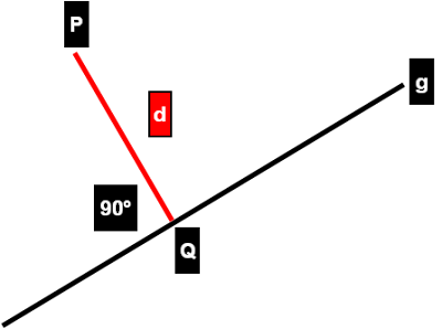 Auch hier hilft eine kleine Skizze. Der Punkt \(Q\) liegt auf der Geraden g und hat somit folgende Koordinaten \[Q\left(1+2t/2t/-2-3t\right)\] Damit ergibt sich für den senktrechten Abstandsvektor \[ \overrightarrow{QP} = \begin{pmatrix} -2t\\ 10-2t\\ 1+3t\\ \end{pmatrix} \] Und wir können das Skalarprodukt formulieren \[ \overrightarrow{QP} \circ \begin{pmatrix} 2\\ 2\\ -3\\ \end{pmatrix} =-4t-4t-9t+20-3=-17t=-17 \Rightarrow t=1 \] Mit diesem t hat der Punkt Q die folgenden Koordianten \[Q\left(3/2/-5\right)\] Und für den Abstandsvektor erhalten wir \[ \overrightarrow{QP} = \begin{pmatrix} -2\\ 8\\ 4\\ \end{pmatrix} \] Und damit beträgt der gesuchte Abstand \[ d= \vert\overrightarrow{QP}\vert = \begin{vmatrix} \begin{pmatrix} -2\\ 8\\ 4\\ \end{pmatrix} \end{vmatrix} =\sqrt{2^2+8^2+4^2}=\sqrt{84}=2\sqrt{21} \] Abstand zwischen einem Punkt und einer Ebene.